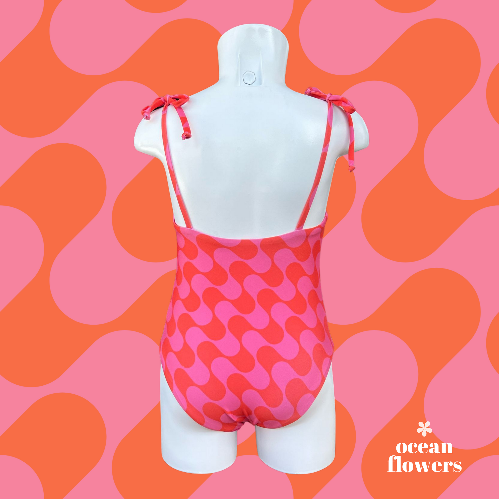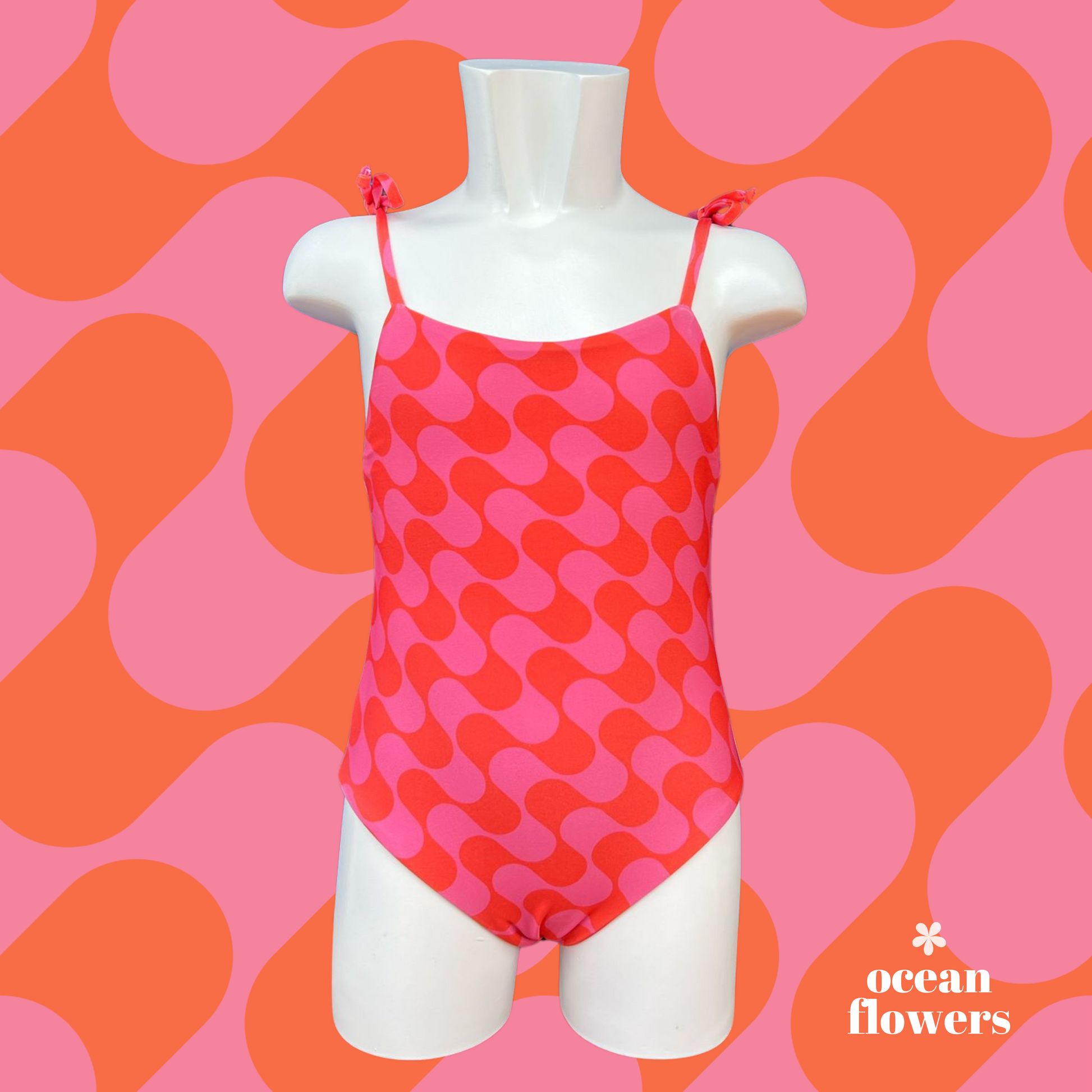 Ocean Flowers swimsuit for baby/kids with pink and red pattern and pink lining.