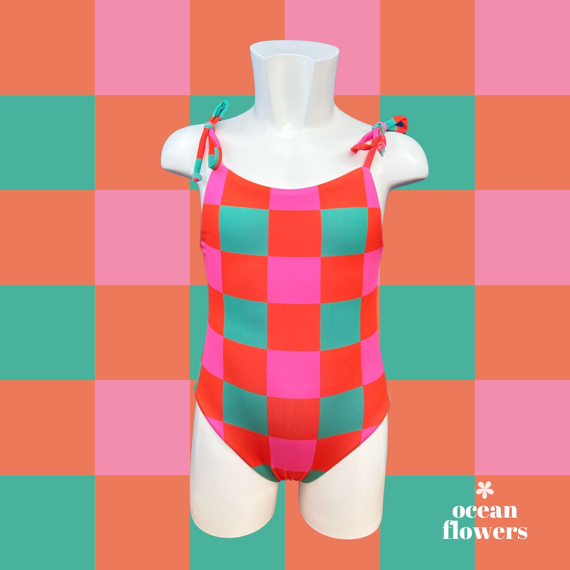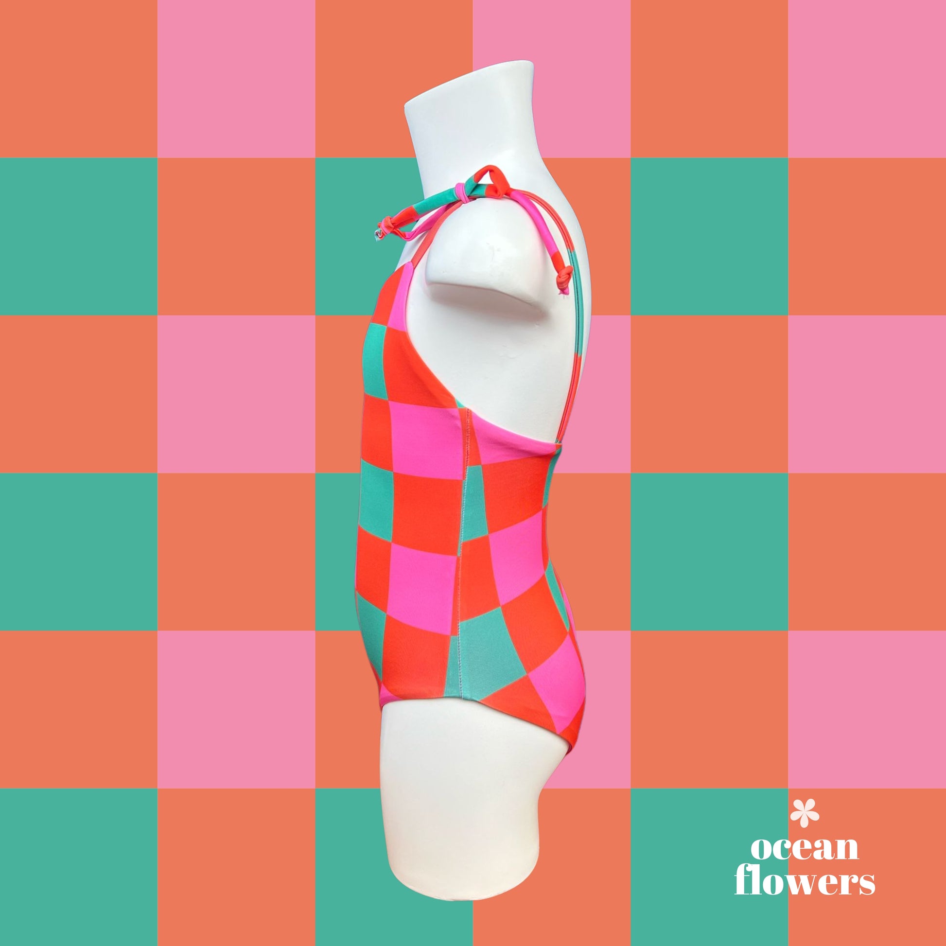 Ocean Flowers swimsuit for baby/kids with a red, pink, and green geometric pattern and pink lining.