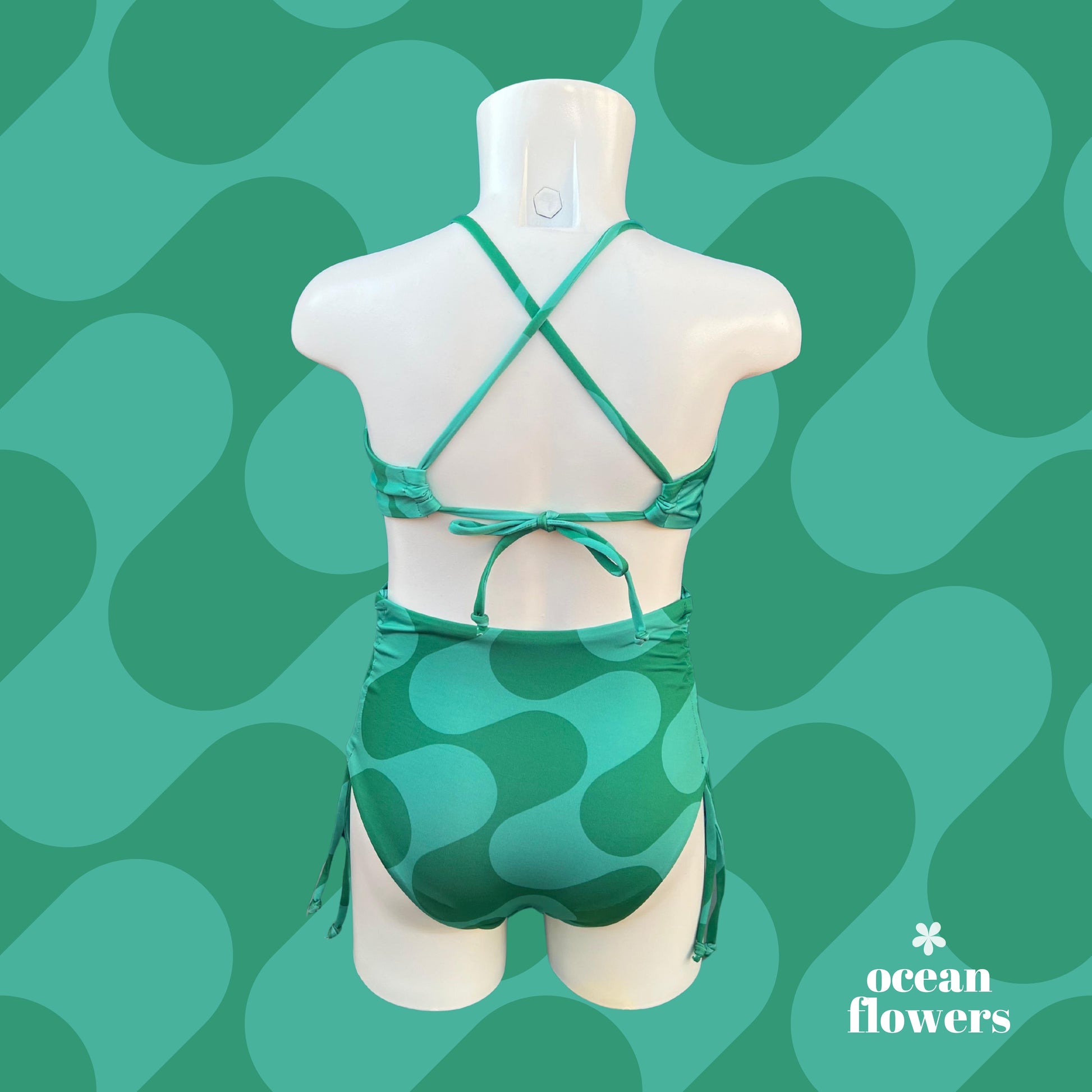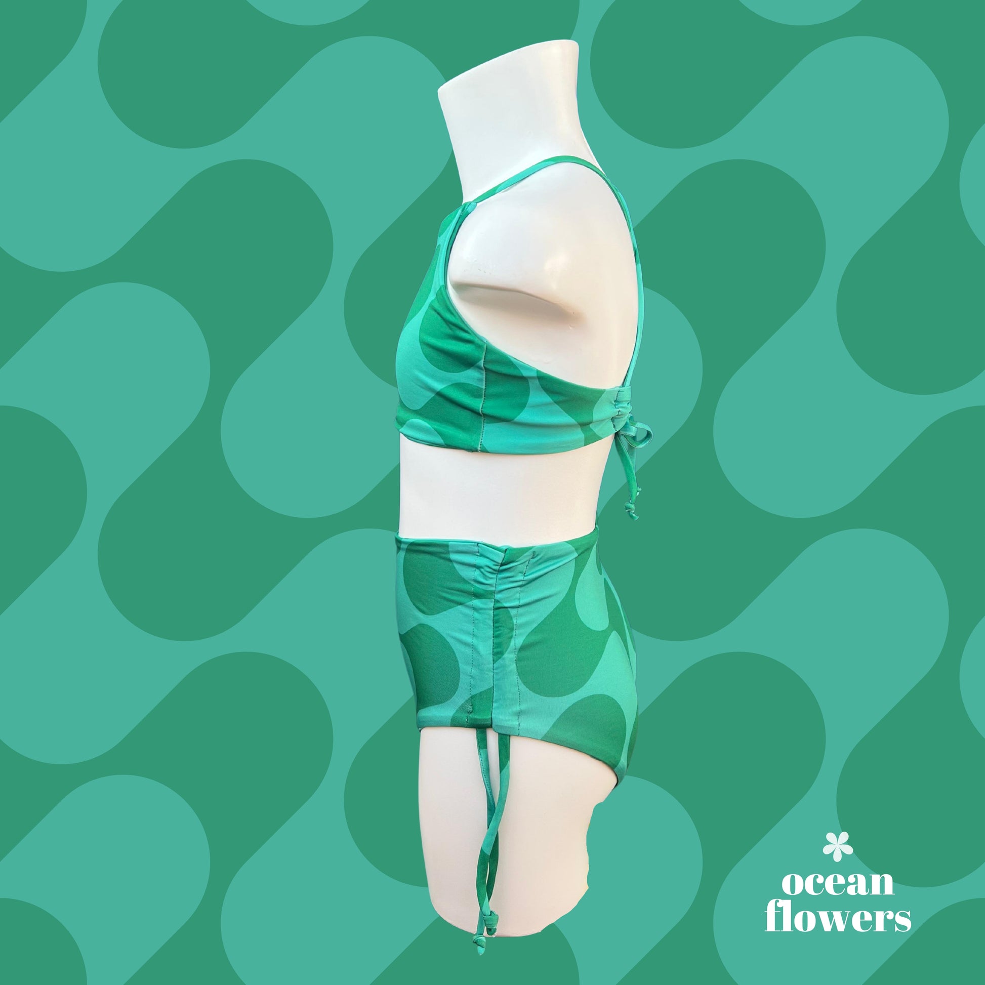 Ocean Flowers swimsuit for baby/kids with a with a two-tone green pattern. Top with adjustable straps and high-waisted bottom.