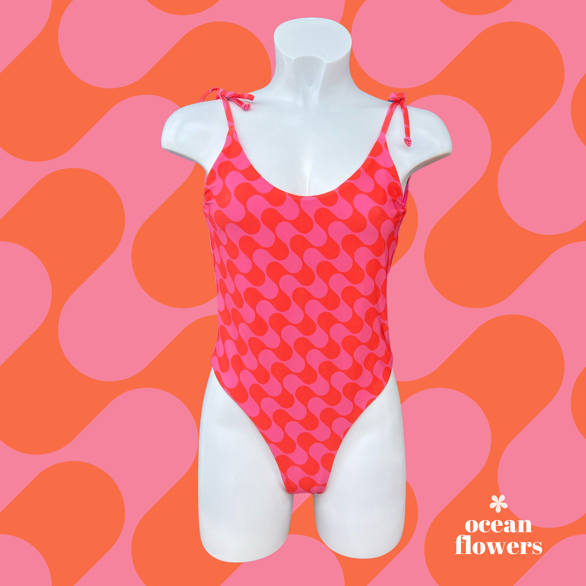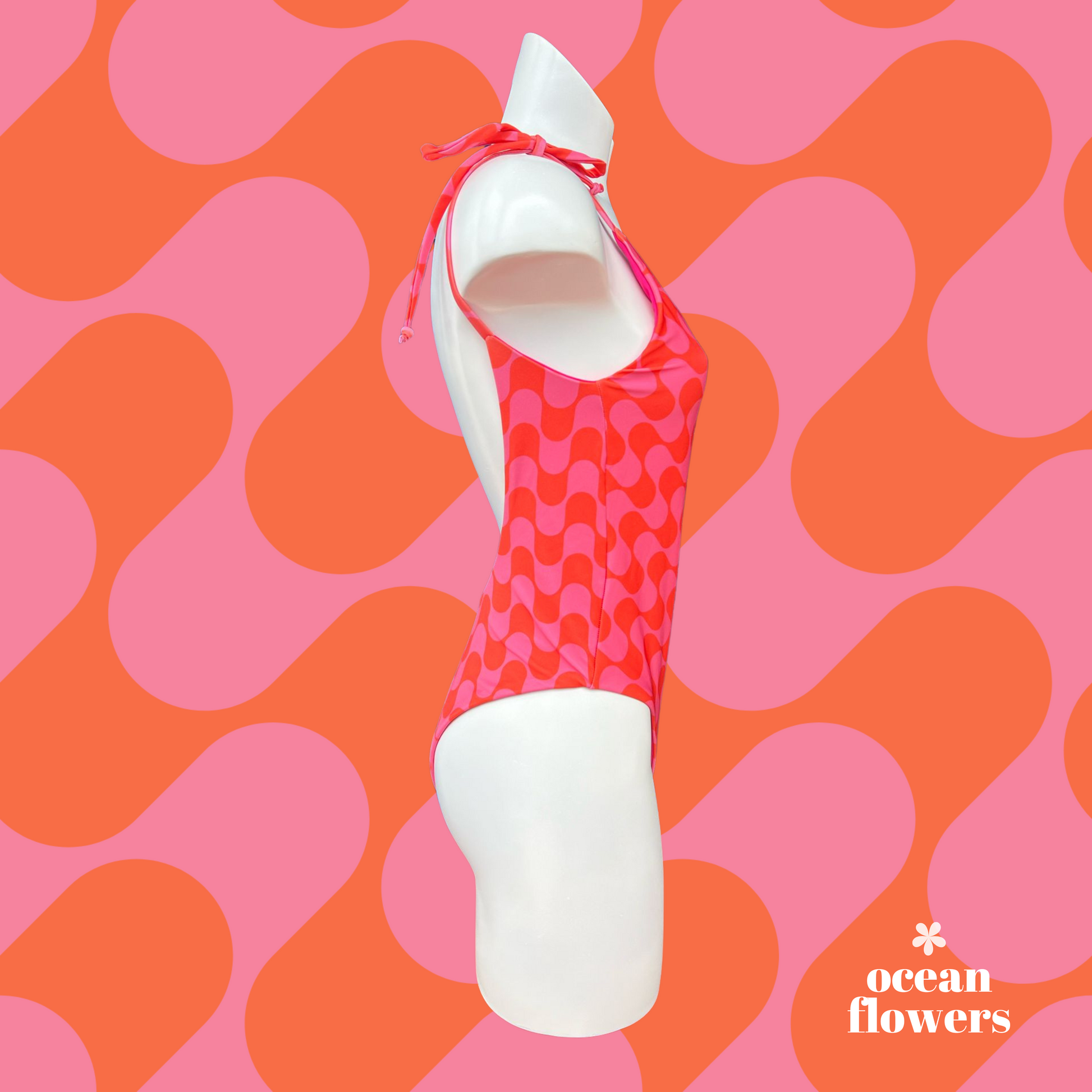 Ocean Flowers women swimsuit with pink and red pattern and pink lining. Round neckline and open back.