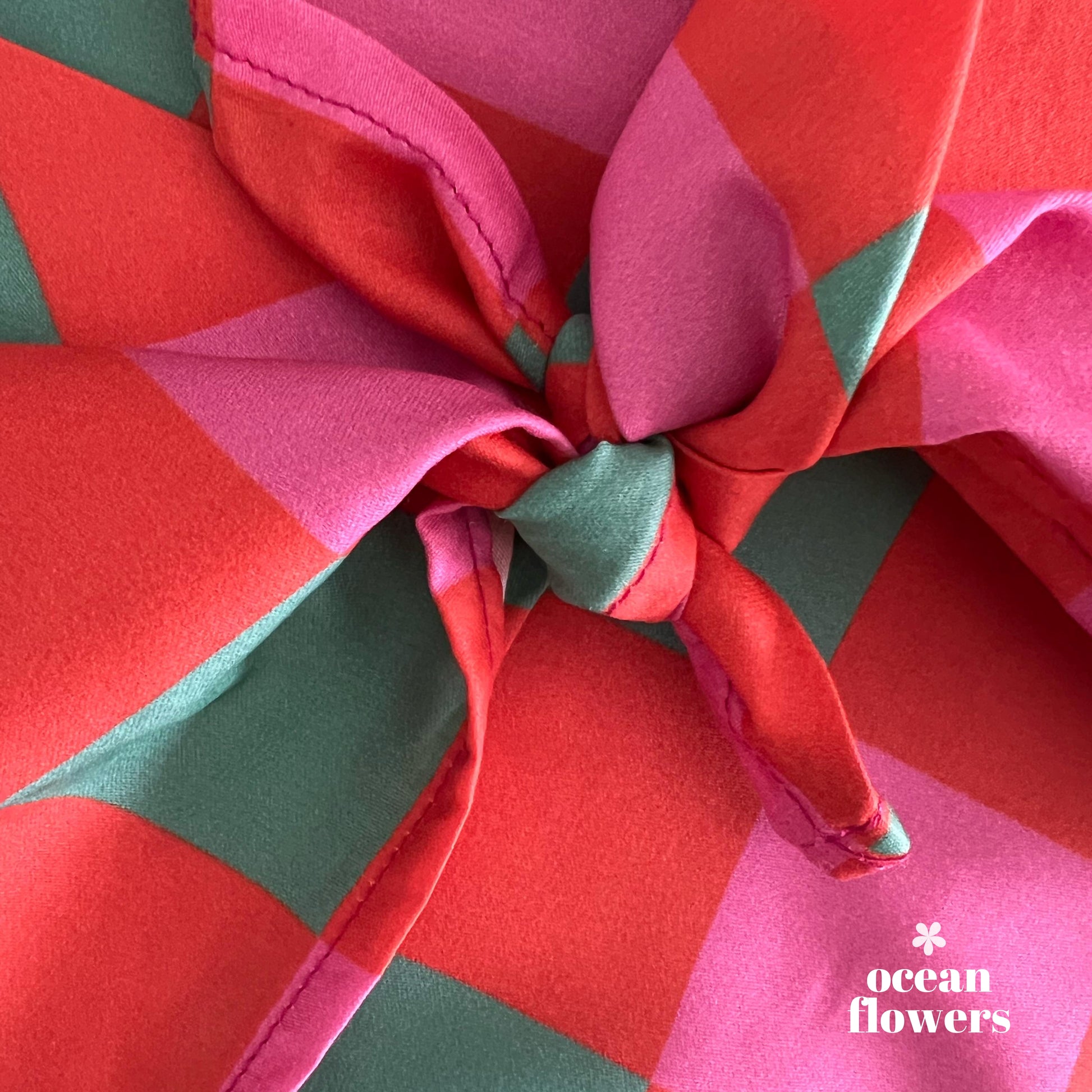 Ocean Flowers baby scarf with a red, pink, and green geometric pattern