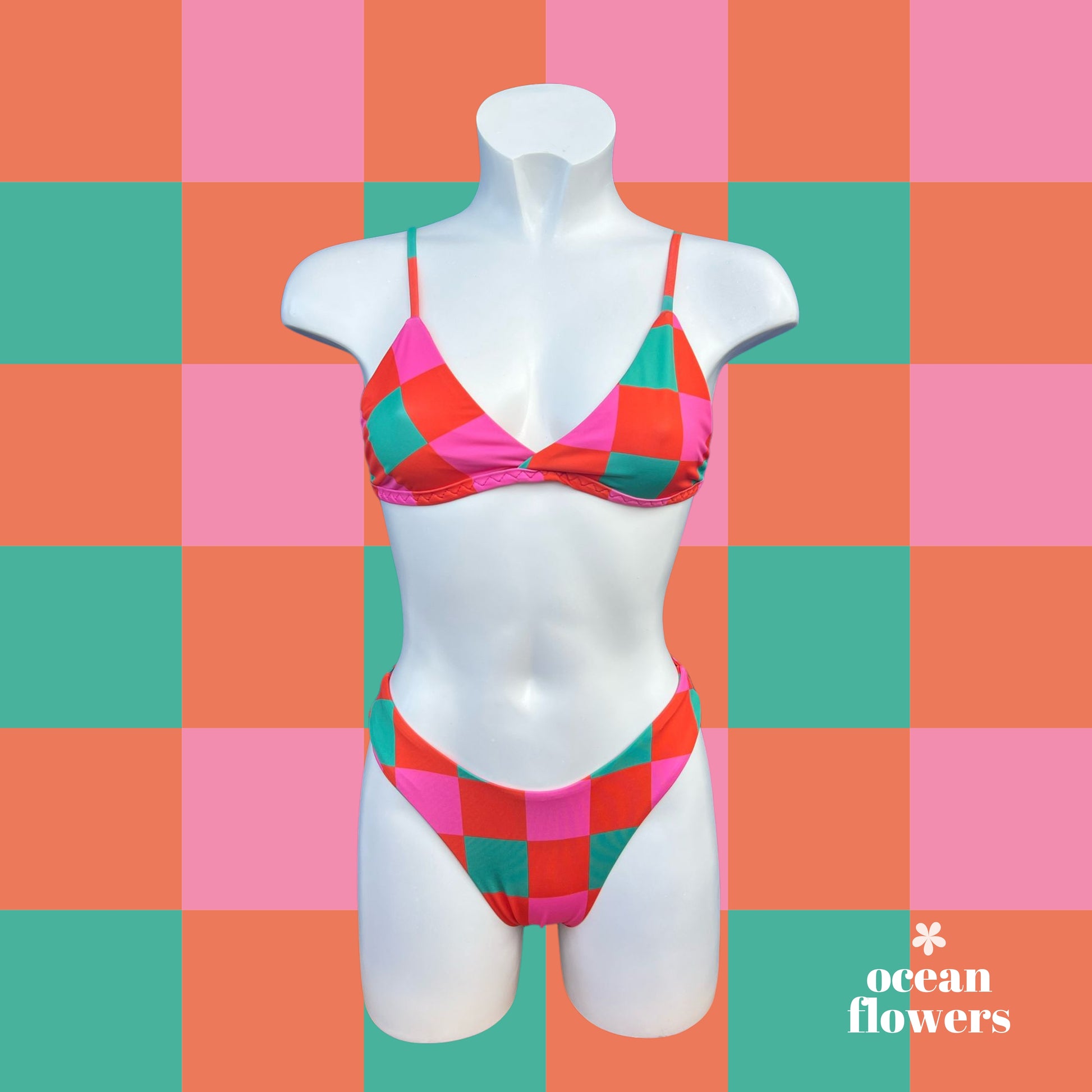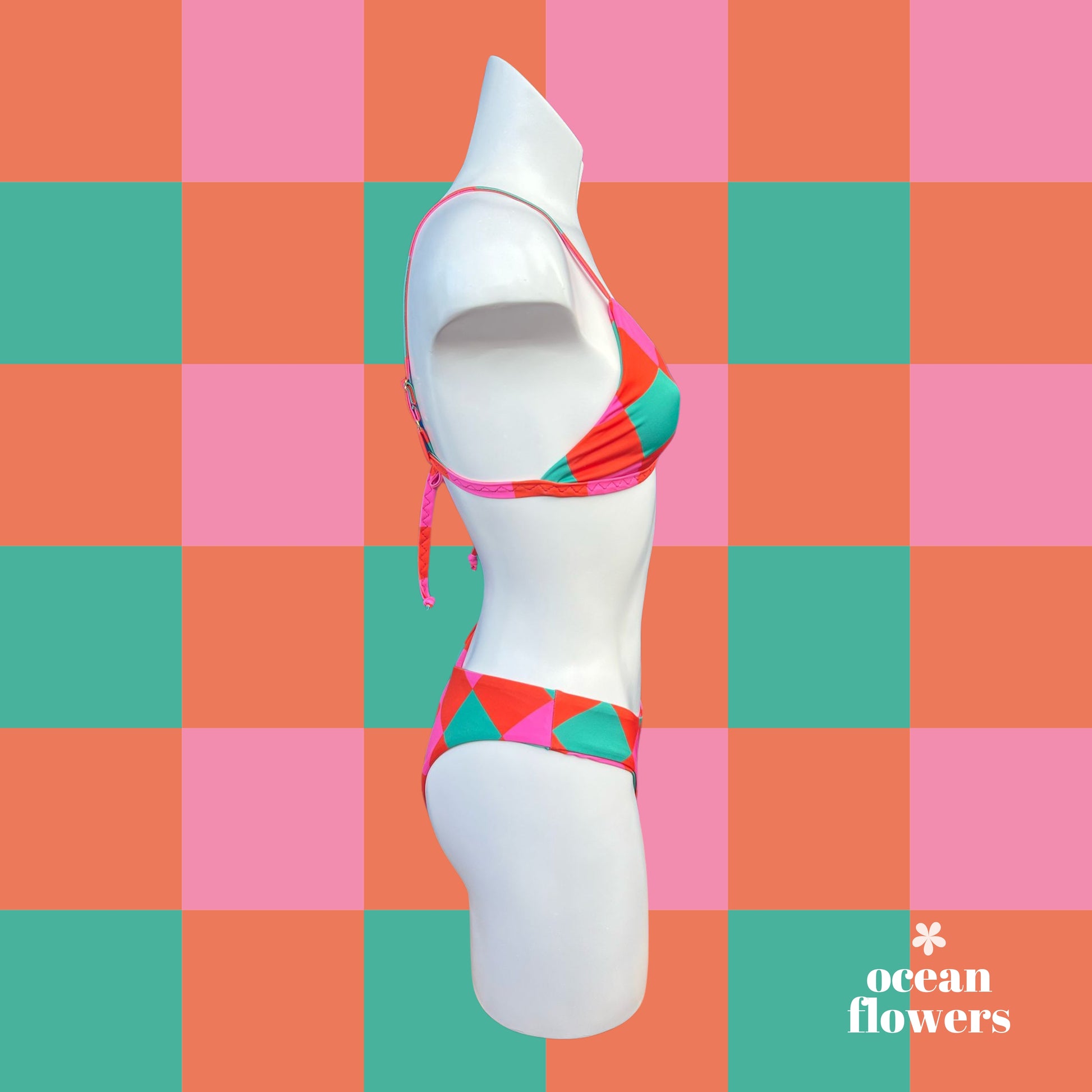 Ocean Flowers woman bikini with a red, pink, and green geometric pattern.