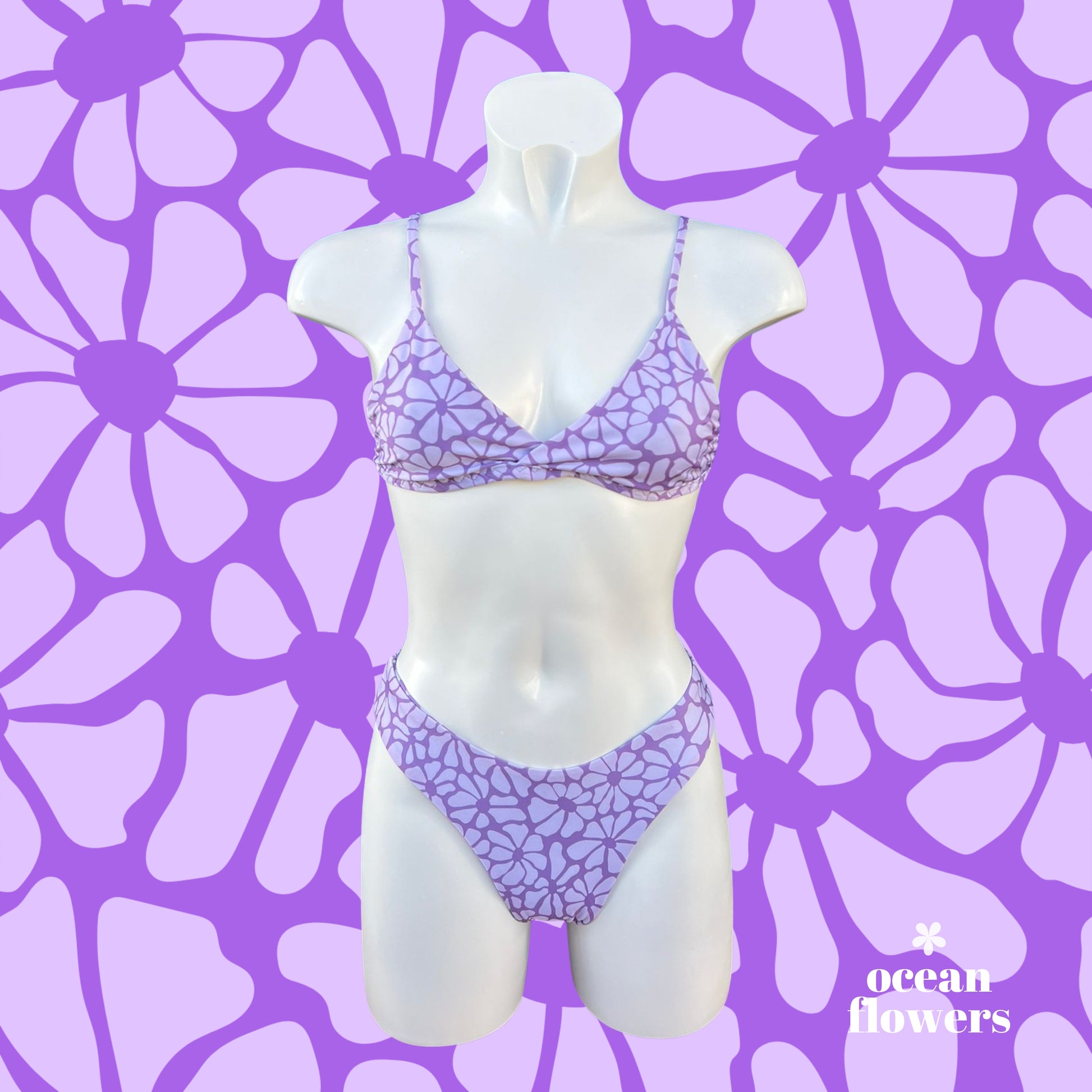 Ocean Flowers woman bikini with purple and lilac floral pattern.