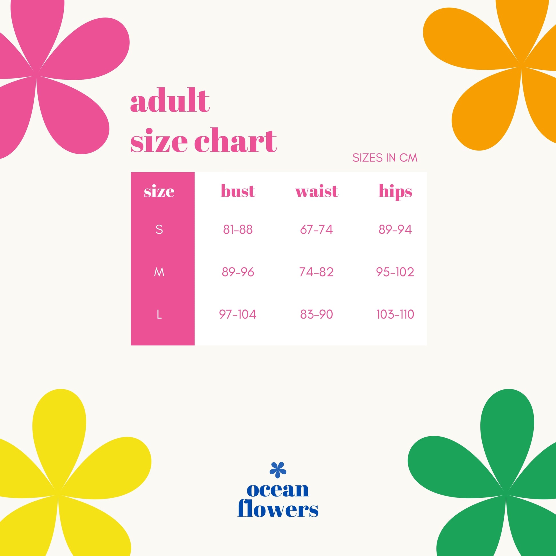 Ocean Flowers are made with high-quality materials so they can be passed down from generation to generation. However, there are a few precautions to keep in mind: carefully hand wash with cold water to remove salt and chlorine residues. Let the swimsuit dry in the shade and only store it when it is dry.