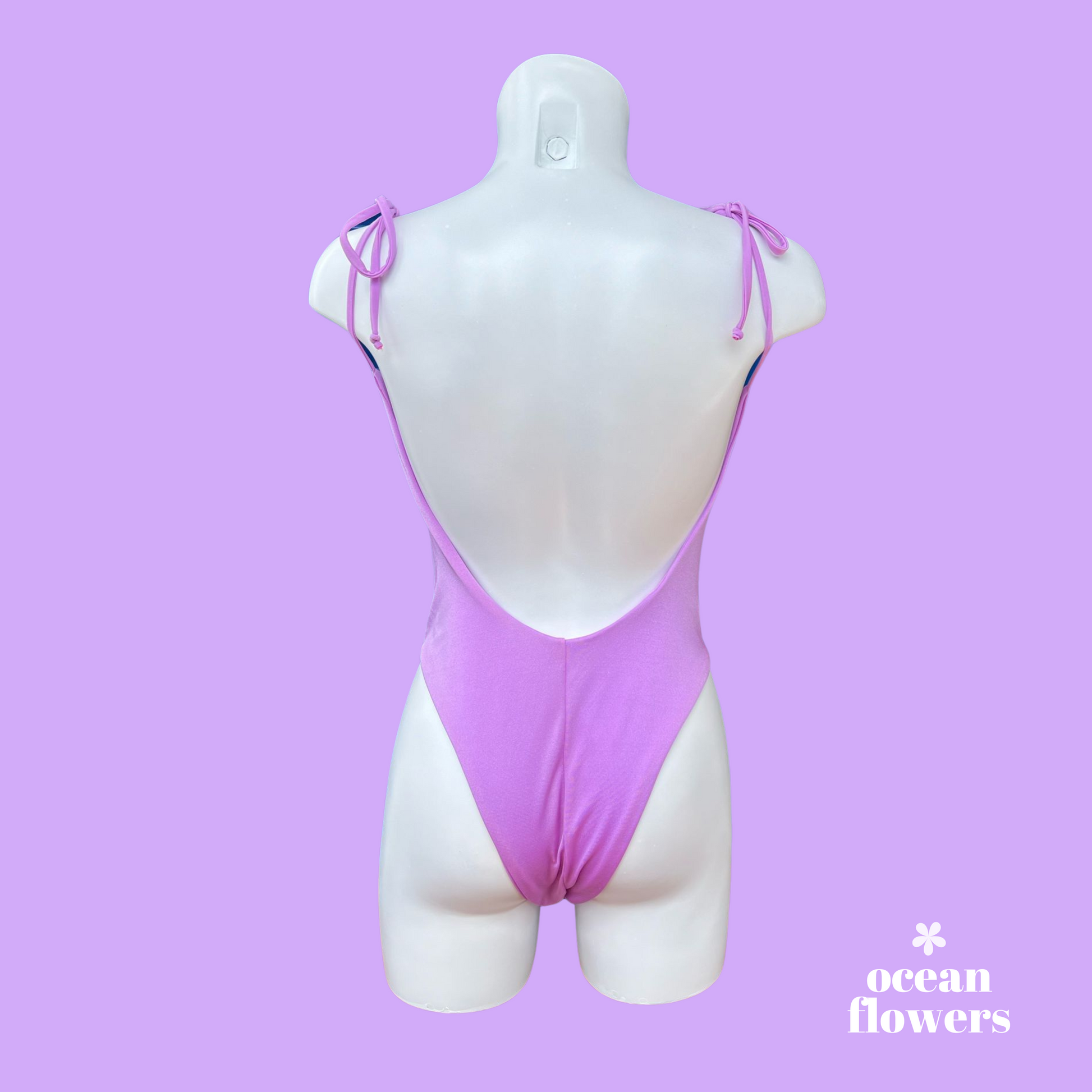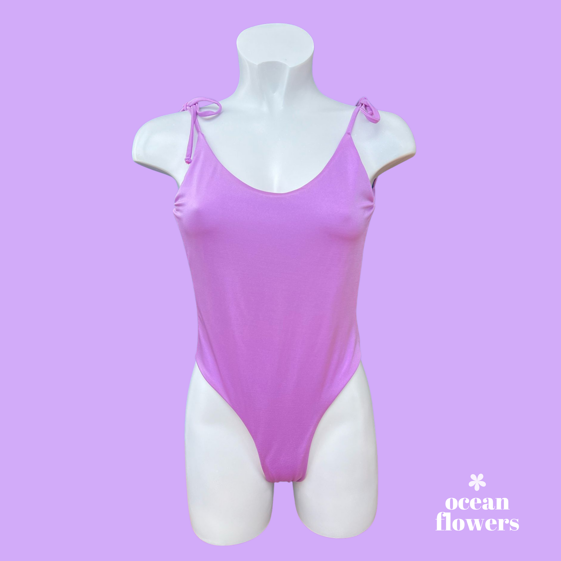 Fato de banho de adulto em lycra brilhante cor lilás. Decote redondo com costas abertas.